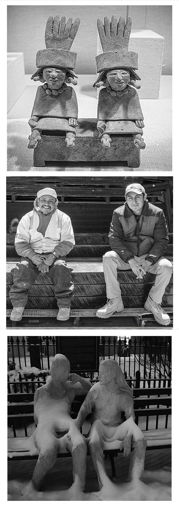 I love these. The comparison of the pre-Columbian with the NYC workers is great. The snow-covered statue of the lovers is a nice third shot, and very good as a standalone photo.